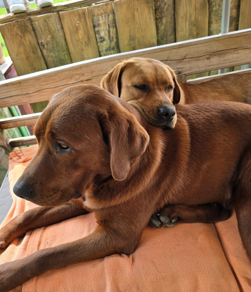Für uns war von Anfang an klar, dass wir eine kleine familiäre Herzenszucht aufbauen möchte. Bei meinem Partner war der Wunsch nach einem Rüden sehr groß. Also machten wir uns wieder auf die Suche nach einem Welpen, dieses Mal in der Farbe Dark Foxred . Im Mai 2023 sind wir im Internet unter Dark Foxred Labrador Retriever auf die Homepage von Heinz Kuhn vom Fichtenberg gestoßen. Wir haben den Fragebogen für Welpen ausgefüllt und den 1. telefonischen Kontakt mit Heinz Kuhn hatten wir im Juni 2023. Heinz ist für uns ein 6er im Lotto. Er hat uns eine Berechnung hinsichtlich IK und AV mit Malua gemacht, so dass wir einen passenden Zuchtrüden bekommen. Am 30.07.2023 kam dann unser Rooney Red Bandit von Fichtenberg zur Welt. Heinz begleitet uns seit 2 Jahren mit all seinem Wissen, hilft uns unsere kleine Zucht aufzubauen und lässt mich bei all seinen Aufgaben teilhaben. Leider hat Rooney die Zuchttauglichkeit nicht bestanden und wir mussten Rooney leider kastrieren. Rooney genießt sein Hundeleben nun als unser Familienhund.