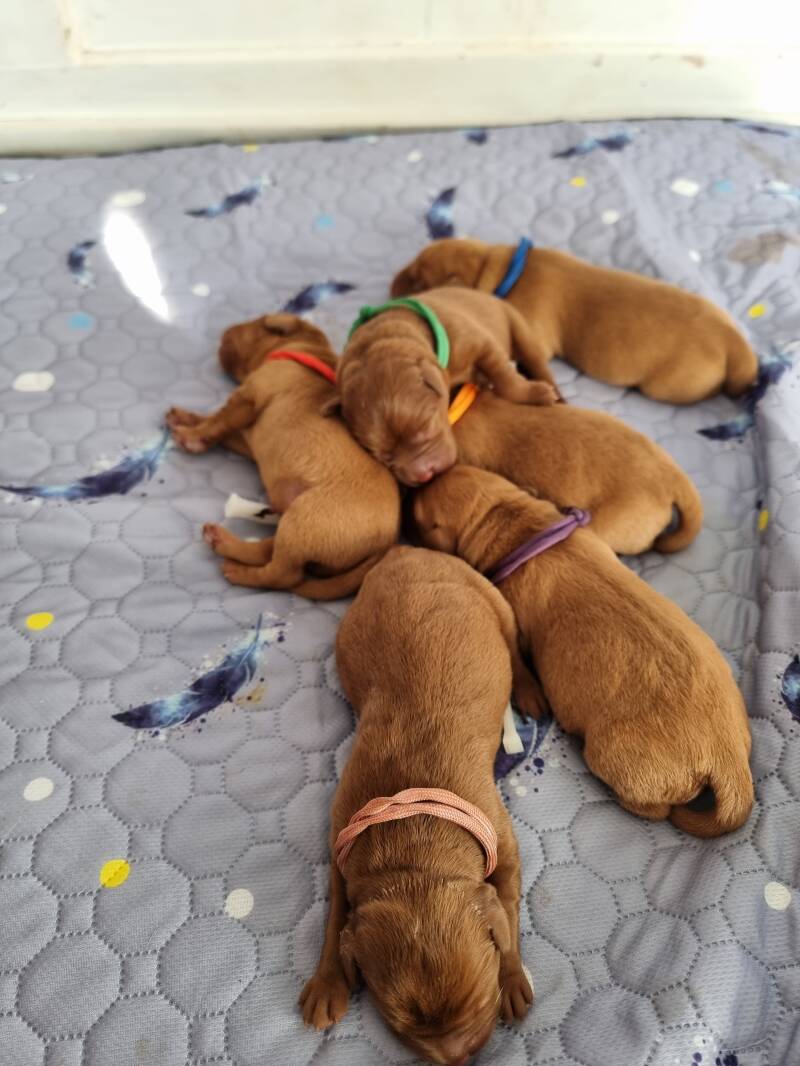 Am 27.11.2025 sind unsere ersten Welpen von Malua zur Welt gekommen. Es sind 4 Rüden und 2 Mädels. Ein Rüde und ein Mädel in der Farbe Dark Foxred und die anderen in Foxred.